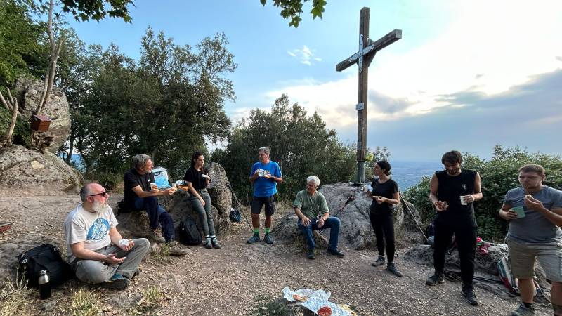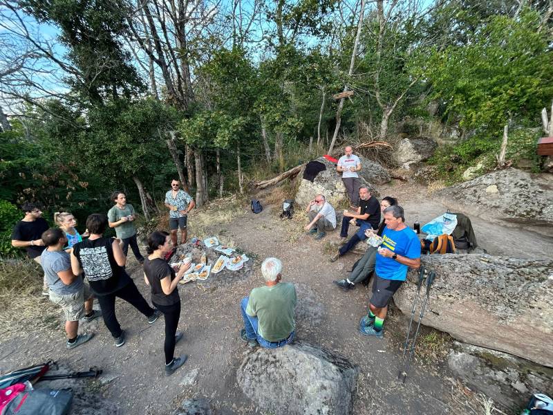 All’arrivo il gruppo ha condiviso cibo e vino come da tradizione, in una piacevole sosta durante la quale il sole ha tramontato specchiandosi nelle colline dietro il lago di Bolsena. “Cerchiamo di rispettare il più possibile i cicli naturali – stavolta parla Stefano Mecorio, altro fondatore – in estate fa caldo e camminiamo meno. Volevamo però comunque riunirci, poiché quando meno si cammina più si programma. Il Consorzio sta infatti andando in convenzione con l’Università per condividere il palinsesto di un programma radiofonico. Nelle volontà del direttivo ci sarebbe anche quella di sviluppare una piccola rubrica su qualche testata, i contatti sono già avviati. E se si parla addirittura di un festival estivo di più giorni sul tema del viaggio lento, in ottica 2026, tra i nuovi interlocutori c’è il negozio di abbigliamento tecnico RRtrek, appena aperto in città lungo la Cassia nord”.