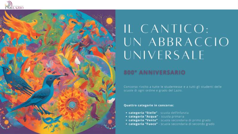 Nell’ottocentesimo anniversario del Cantico delle creature l’Ufficio scolastico regionale per il Lazio attraverso il bando di concorso “Il Cantico: un abbraccio universale” vuole ricordare uno dei testi più antichi della letteratura italiana, il primo di cui si conosca l’autore. Francesco d’Assisi, nel suo Cantico, racchiude un prezioso insegnamento sul valore del Creato sia attraverso la profondità di uno sguardo interiore da rivolgere alla Madre Terra che al rispetto per la natura e per gli animali, al tempo, mai presi in considerazione. Questo bando di concorso invita tutti a riflettere e a esprimere, con varie forme artistiche e letterarie, il prezioso insegnamento contenuto nel capolavoro di Francesco d’ Assisi: il rispetto e l’amore per la natura e tutte le sue creature.