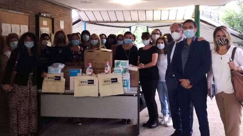 ROMA - Il Vice Direttore Generale Vicario della Banca di Credito Cooperativo di Roma Francesco Petitto ha consegnato oggi alla Dirigente scolastica Stefania Zega dell’I.C. M. Virgili di Ronciglione 1200 mascherine, gel disinfettanti, guanti in lattice e borse per conservare gli indumenti degli alunni durante le lezioni in classe.