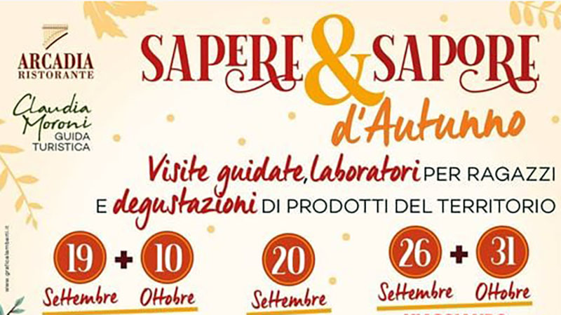 TARQUINIA - S’intitola “Sapere e sapore d’autunno” ed è il ricco calendario di iniziative proposto dalla guida turistica tarquiniese Claudia Moroni, dal 19 settembre alla metà di novembre, per ammirare le bellezze artistiche della Tuscia e assaporare i suoi prodotti enogastronomici. Sono in programma visite guidate e laboratori per ragazzi, nonché degustazioni curate dal ristorante Arcadia di Tarquinia.