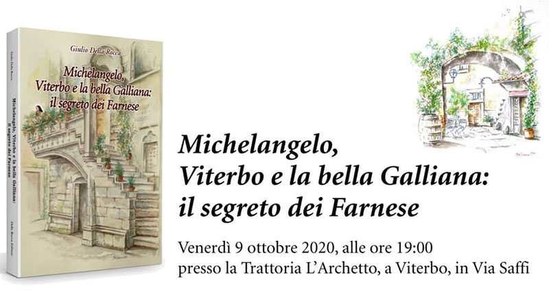 VITERBO - Sarà presentato oggi 9 ottobre, il romanzo scritto da Giulio Della Rocca "Michelangelo, Viterbo e la bella Galliana: il segreto dei Farnese", alle ore 19:00 presso la Trattoria L'Archetto, in via Saffi (Via S. Cristoforo, 1).