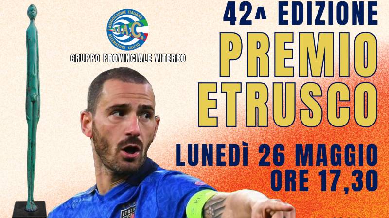 VITERBO - Lunedì 26 maggio alle ore 17.30 la 42esima edizione del Premio Etrusco, il tradizionale appuntamento di fine stagione promosso dalla sezione Aiac di Viterbo nel quale viene consegnata l’ambita e prestigiosa statuetta dell’ “Etrusco” ai tecnici associati alla sezione che hanno vinto i rispettivi campionati dilettantistici e giovanili.