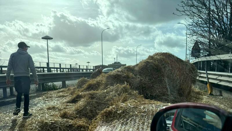 Covoni di paglia bloccano la tangenziale Giorgio Almirante verso la Tuscanese