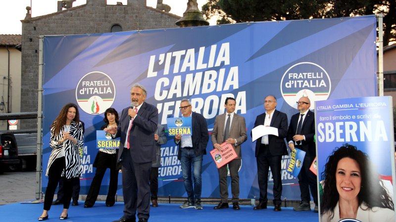 VITERBO - Fratelli d'Italia si compatta e porta l'intera classe dirigente della Regione sul palco di piazza del Gesù, presentata dall'onorevole Rotelli, per sostenere Antonella Sberna, chiudendo l'incontro con l'intervento del presidente Rocca, che non si sottrae e affronta lo spinoso argomento della discarica, rimandando al mittente le critiche.