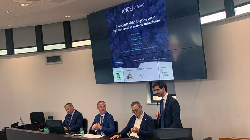 VITERBO - Si è svolto stamani, presso la sede di Unindustria e Ance, l'incontro "Il supporto della Regione Lazio agli enti locali in materia urbanistica", a cui hanno partecipato Pasquale Ciacciarelli, assessore a Urbanistica, Politiche abitative, Case popolari, Politiche del mare della Regione Lazio, il presidente di Ance Lazio Domenico Merlani e il presidente di Ance Viterbo Andrea Belli.