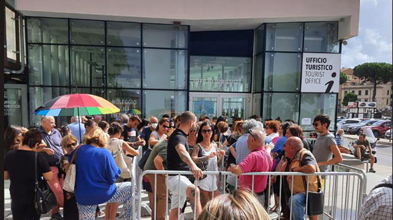 Sono tante le persone in fila da questa mattina, molto prima dell'apertura dell'ufficio turistico stesso, e come sempre si fa una coda autogestita.
