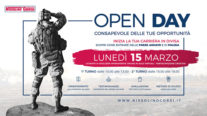 VITERBO - La Nissolino Corsi, realtà leader nella preparazione dei Concorsi Militari, lunedì 15 Marzo organizzerà l’Open Day - Giornata di Orientamento alle Professioni in Divisa – durante il quale tutti i giovani interessati alla carriera in divisa potranno ottenere tutte le informazioni sui bandi di concorso e sulle opportunità di studio e professione fornite dalle Forze Armate e dalle Forze di Polizia.