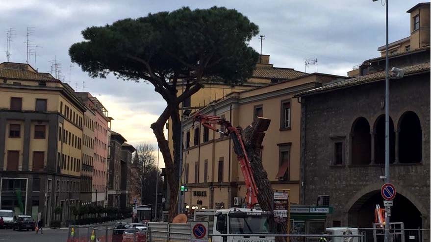 VITERBO - Una nuova ferita alla città: cambia per sempre lo skyline di piazza Verdi, quella in cui domina il Teatro, e che aveva, un po' nelle storiche cartoline di Napoli, un meraviglioso pino a fare da quinta. Aveva, perché da oggi non c'è più. E' stato tagliato, miseramente, tristemente.