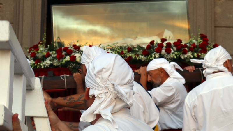 VITERBO - Qualche attimo di pioggia esattamente nel momento in cui doveva uscire l'urna, pochi muniti di attesa, con i Facchini tornati dentro il Santuario, il tempo di veder di nuovo il cielo azzurro e prepararsi alla processione.