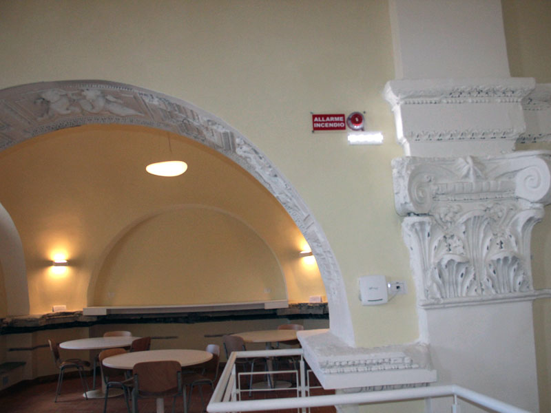 Dal punto di vista architettonico la scelta è andata su un soppalco in ferro realizzato nella parte centrale, per rendere fruibile la grande cubatora sottotetto di quella che era una chiesa. Per gli studenti molte scrivanie dotate di prese, collegamento di rete wifi, mentre per il personale sono stati ricavati tre uffici con molte postazioni.