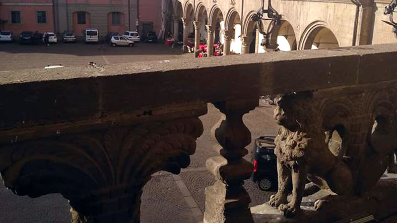 "La prima cosa che ho notato quando, nominato vicesindaco, mi sono sistemato nell'apposito ufficio di Palazzo dei Priori - scrive Contardo - è che uno dei simboli della nostra città, il balcone in peperino che affaccia su Piazza del Comune, con scolpiti i leoni e la palma di Viterbo si stava sbriciolando, i secoli, gli agenti atmosferici e i piccioni, hanno recato gravi danni".