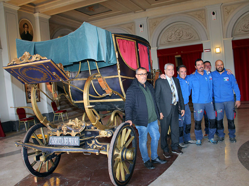 VITERBO - Quattro anni di attesa, da quel triste viaggio nel 2014, quando la precedente amministrazione decise di riporla in magazzino. Stamani il ritorno alla luce: la carrozza dei priori ha ritrovato la dignità, dimenticando per sempre, si spera, polvere e buio.