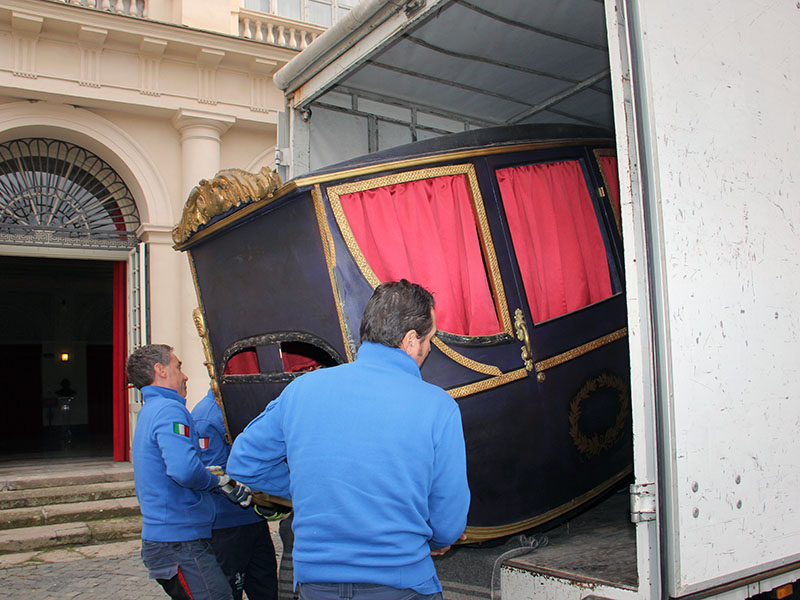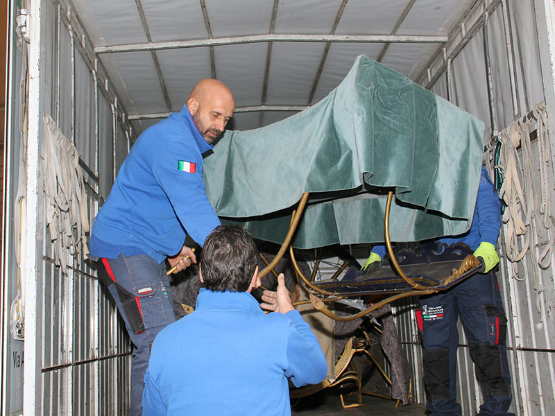Eccola, è stata prelevata stamani, dalla ditta Grazini Traslochi, la stessa che l'aveva accompagnata nel viaggio di andata, alla presenza del sindaco Arena e dell'assessore Contardo, primo fan della carrozza settecentesca.