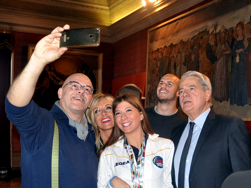 VITERBO - Il sindaco Giovanni Maria Arena ha consegnato un attestato di merito alla campionessa mondiale di pattinaggio artistico Ludovica Delfino.