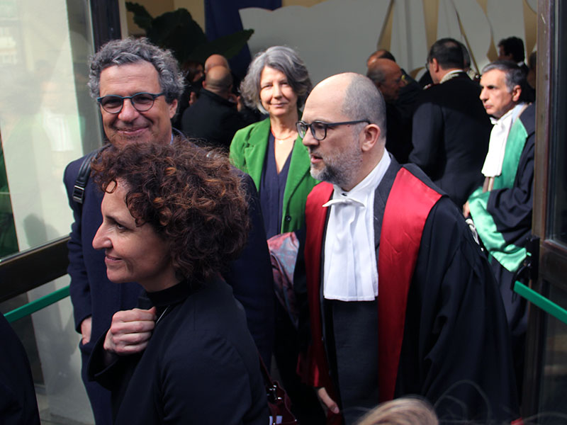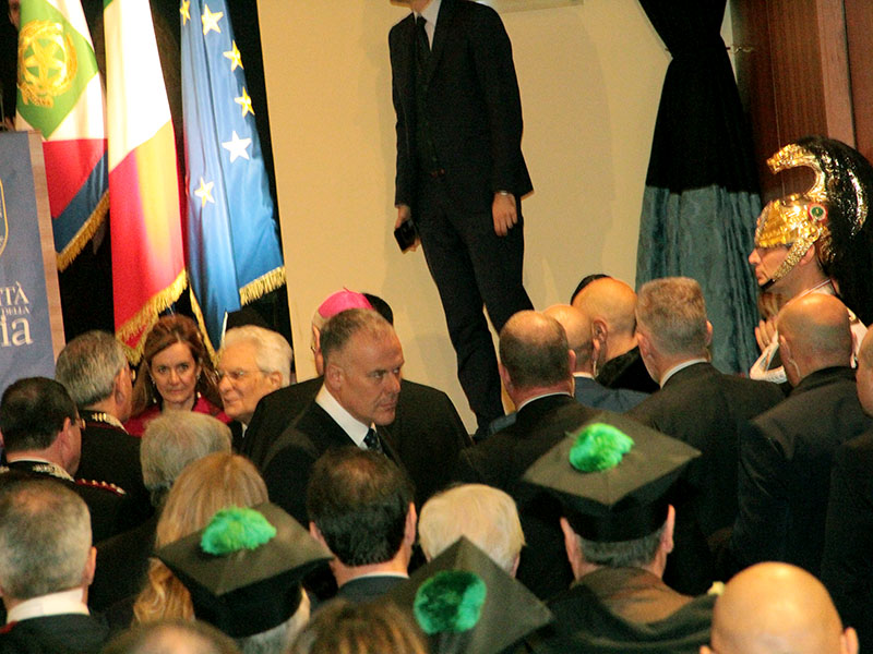 Alle 11.05 l'arrivo in sala accompagnato dal Rettore Ruggieri, un attimo prima l'ingresso di due Corazzieri, e il vice presidente della Corte Costituzionale.