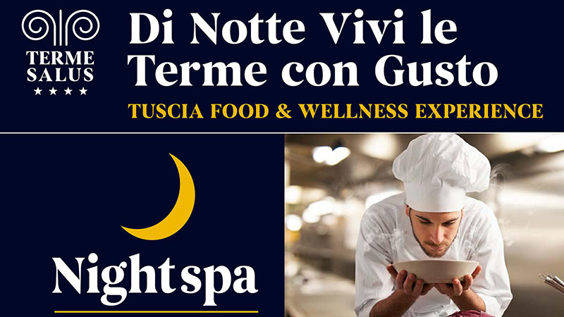 La proposta di una serata di benessere in accappatoio, gustando sapori tipici del territorio tra rilassanti percorsi termali sotto le stelle, incontra ormai da diversi mesi il favore del pubblico, che partecipa sempre numeroso agli appuntamenti di Vivi le Terme con Gusto. Questo il programma della serata: dalle 19,30 alle 23,30 sarà possibile accedere al percorso Etruscan Wellness nella spa dell’Hotel Salus Terme; alle 20,30 percorso esclusivo alla scoperta dei sapori della Tuscia immersi in un’oasi di benessere; alle 21,30 l’evento Mangiafuoco sotto le stelle.