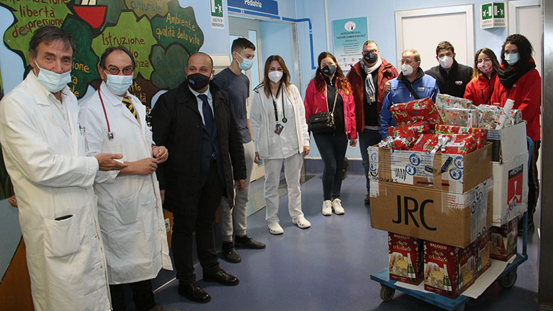 VITERBO - Giornata di strenne natalizie per i bambini ricoverati in Pediatria a Belcolle: dopo la visita del Rotaract e Rotary, il primario Bracaglia, il dirigente Nicolanti e la dottoressa Cuomo hanno accolto l'Avis Viterbo, con il proprio carico di doni.