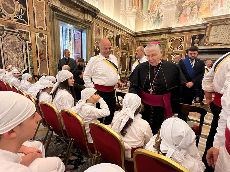 Grazie per ciò che fate, e per le tante attività assistenziali, culturali e morali con cui so che rendete operativo e concreto nella vita delle persone, specialmente le più bisognose, cio che rappresentate in occasione della Festa. Vi incoraggio a tenere viva questa tradizione e di cuore vi benedico. E vi raccomando, non dimenticate di pregare per me§". Papa Francesco