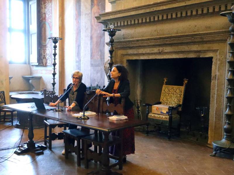 Prima di avviare la conferenza, saluti istituzionali della direzione del palazzo, con le dottoresse Adele Trani e Marta Giuseppina Ragozzino, neo direttrice delle Ville monumentali della Tuscia.