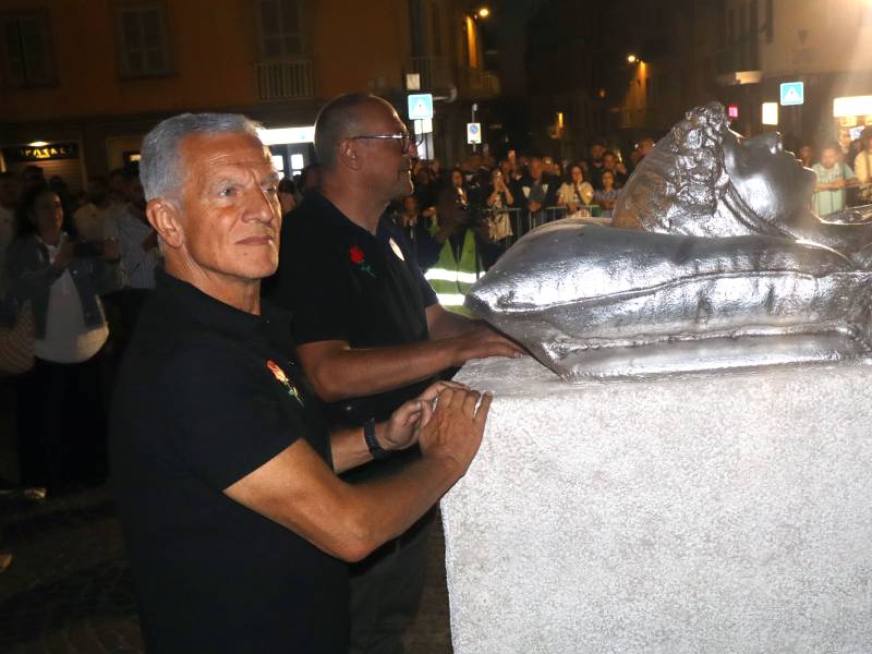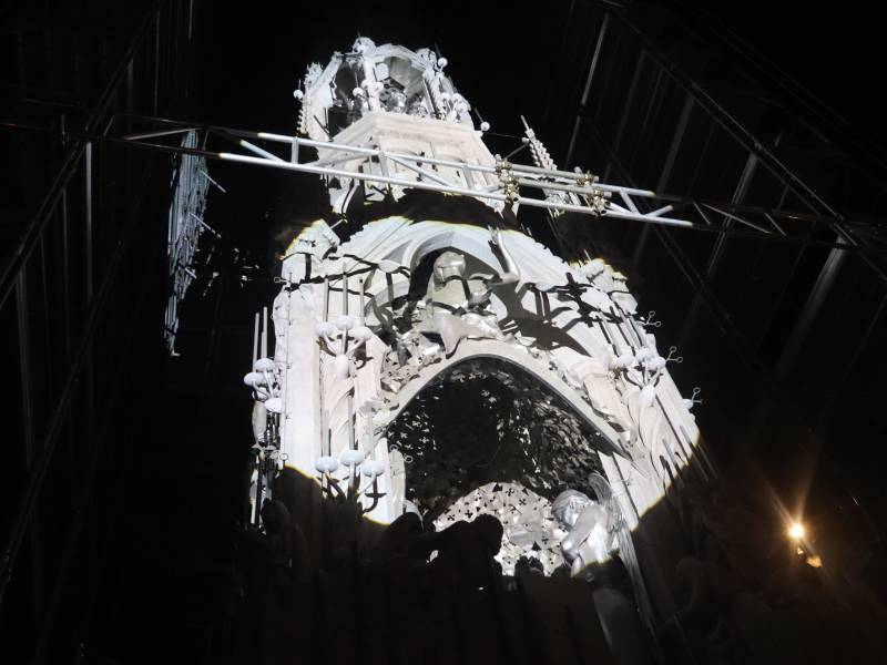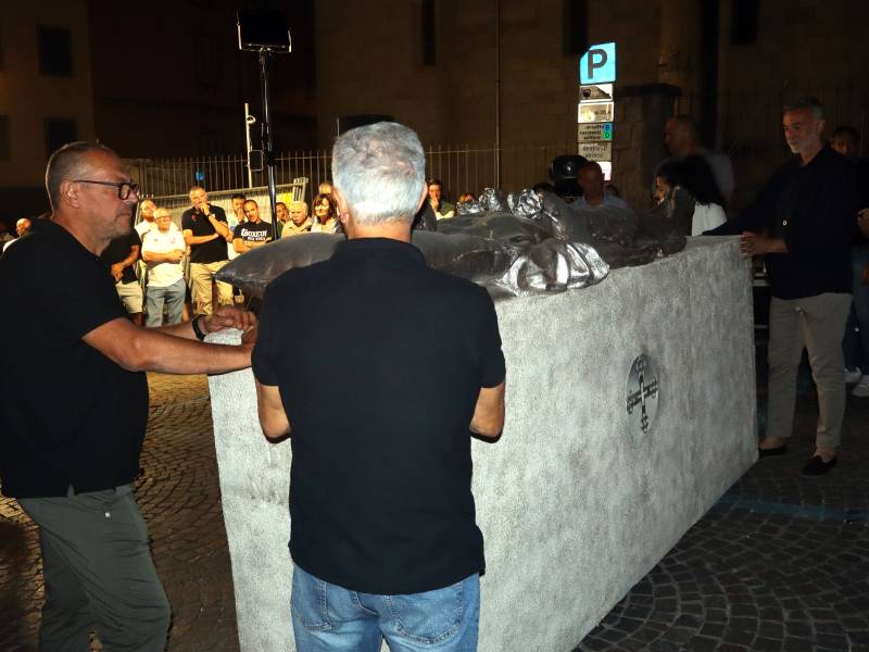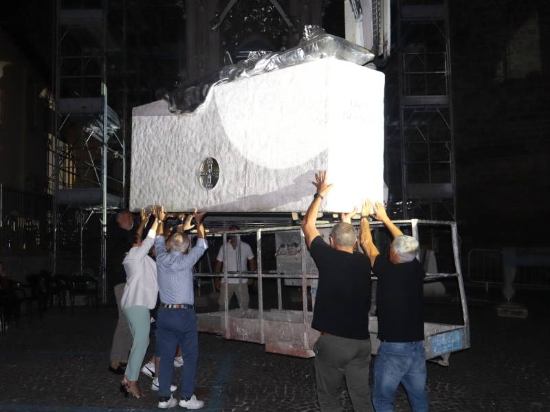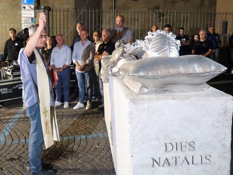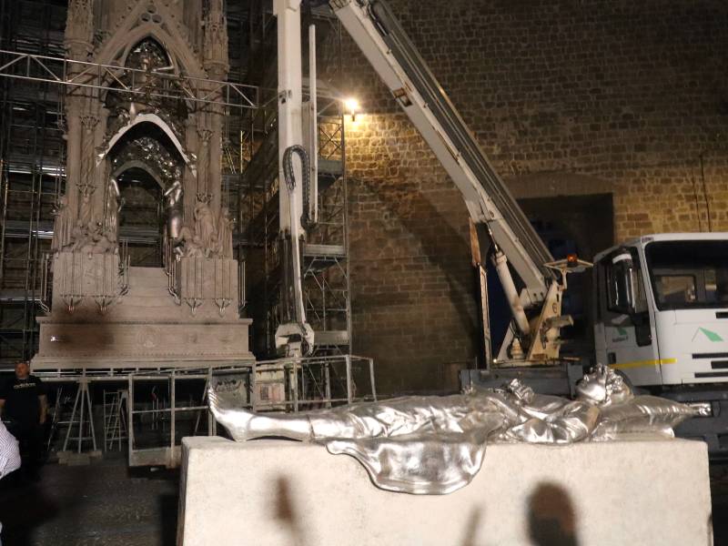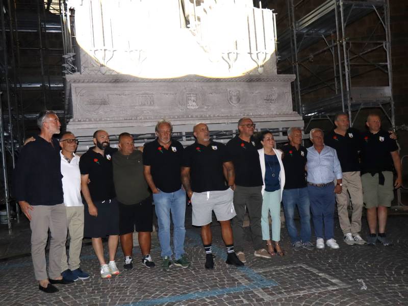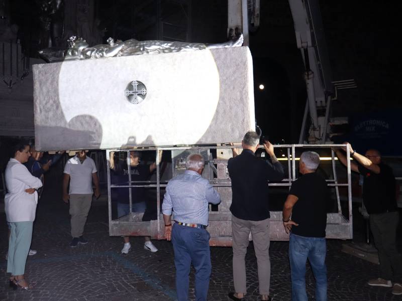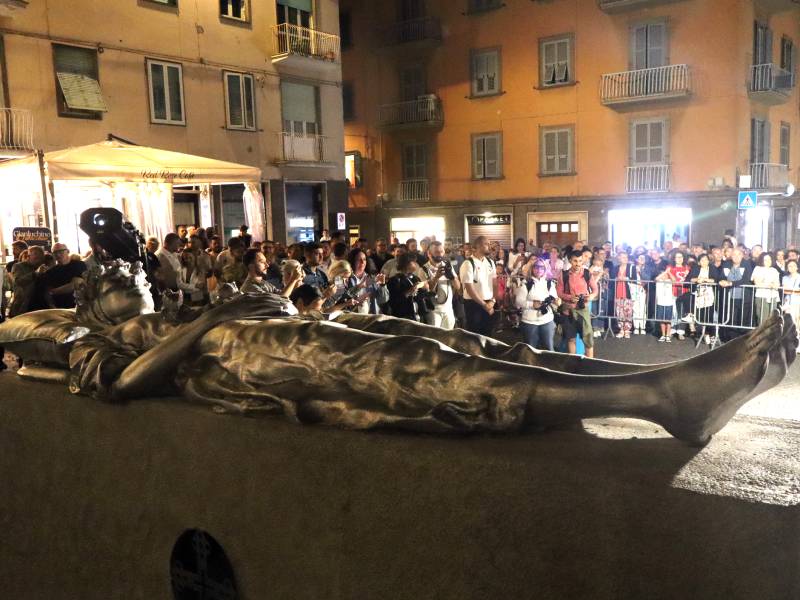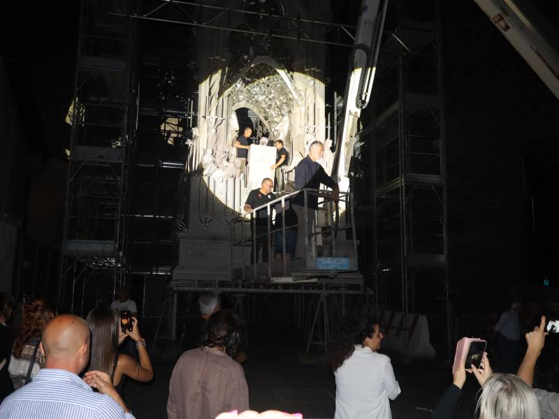 A sollevare l'ultimo prezioso pezzo il sindaco Chiara Frontini proprio con Ascenzi, dall'altra parte il capofacchino Luigi Aspromonte e il presidente del Sodalizio Massimo Mecarini. Il tempo di girarla, perché lo sguardo deve andare verso la via e la città e non il muro, e la salita, stavolta solo con Ascenzi, Aspromonte e gli operai dell' Impresa Fiorillo che compiono questo ultimo gesto, inseriscono Rosina al centro e la lasciano riposare li, contornata dagli angeli.