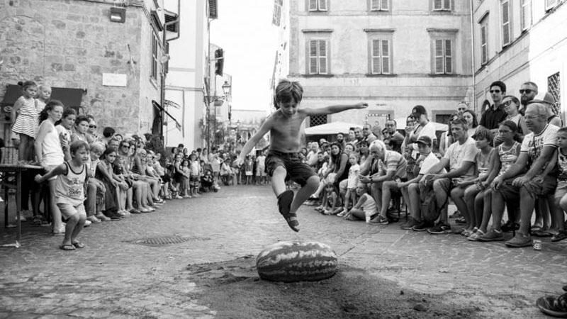 "Andrea, 35 anni, a Bolsena (in provincia di Viterbo) c'è nato e cresciuto. Di feste di San Rocco, dunque, ne ha viste (e fotografate) ben tante. 'Il 16 agosto tutto il paese è coinvolto. E i bambini, da oltre cent'anni, fanno a gara a schiacchiare un cocomero con il sedere: chi riesce a romperlo se lo può portare a casa. L'ho fatto io, lo fa mio figlio, che è il bambino ritratto nella foto: è una tradizione che sopravvive finché c'è gente che abita il borgo. E che spero che non muoia mai'. Andrea racconta di quanto sia bello quel momento, con la quiete che si respira per le strade di Bolsena e le voci della gente che sostituiscono il rumore delle macchine. 'Il complimento più bello me l'ha fatto mia nonna, che guardando questa foto mi ha detto: Andrea, poteva essere stata scattata anni fa, non è cambiato nulla'". Il vincitore del primo premio della giuria - che ha apprezzato la storia che racconta quest'immagine, quella di un paese vivo e vitale - ha la passione da sempre della fotografia, adora la ritrattistica ma anche il contatto con la natura e le passeggiate per i quartieri di Roma che ancora somigliano a piccoli borghi. Ed è preoccupato per lo spopolamento dei paesi: 'Se non si crea un tessuto economico che possa rendere autosufficienti questi borghi, i ragazzi non torneranno indietro finiti gli studi universitari. E i borghi scompariranno. Puntiamo sul turismo, sui prodotti tipici, sulle nostre meraviglie: è difficile trovare un'altra Nazione con le stesse potenzialità!'.