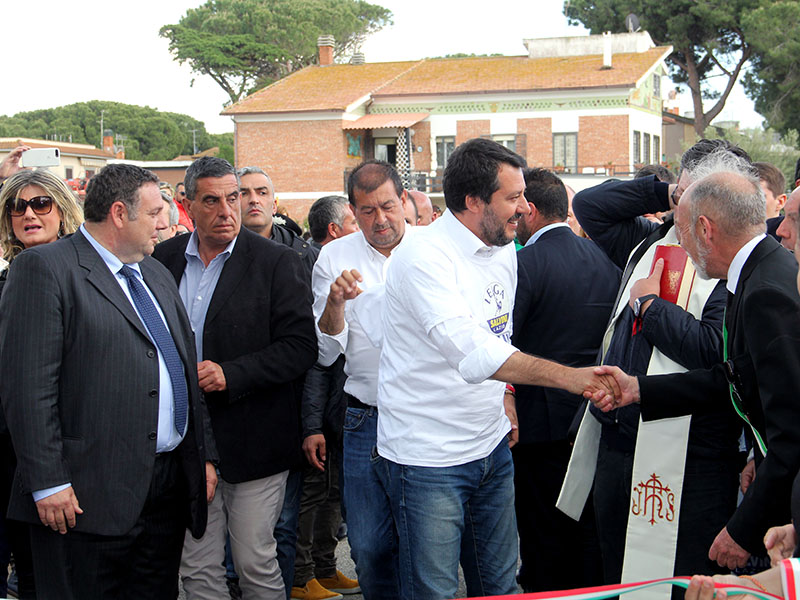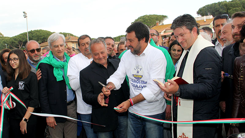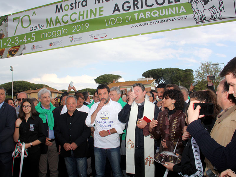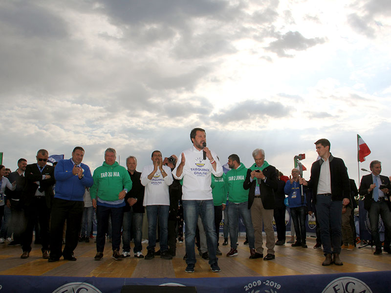 TARQUINIA - Bagno di folla era previsto e bagno di folla è stato: Salvini recupera in corsa e dopo aver saltato la piazza di Civita Castellana per i ritardi accumulati in mattinata, si riprende il titolo di Capitano dal palco sul lungomare, dopo il taglio del nastro della Fiera dell'agricoltura.