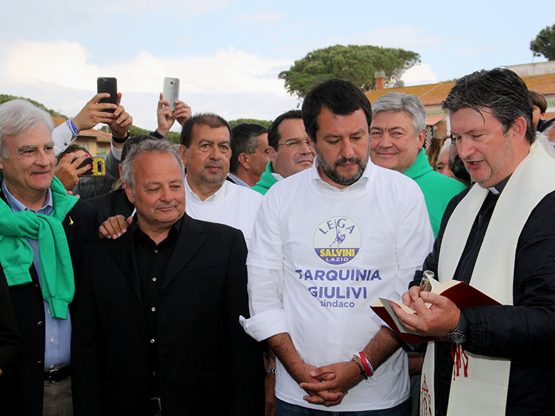 E' il momento della benedizione, che Salvini segue con raccoglimento, e poi si getta tra la folla.