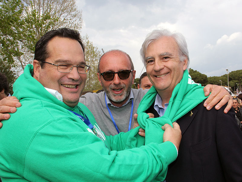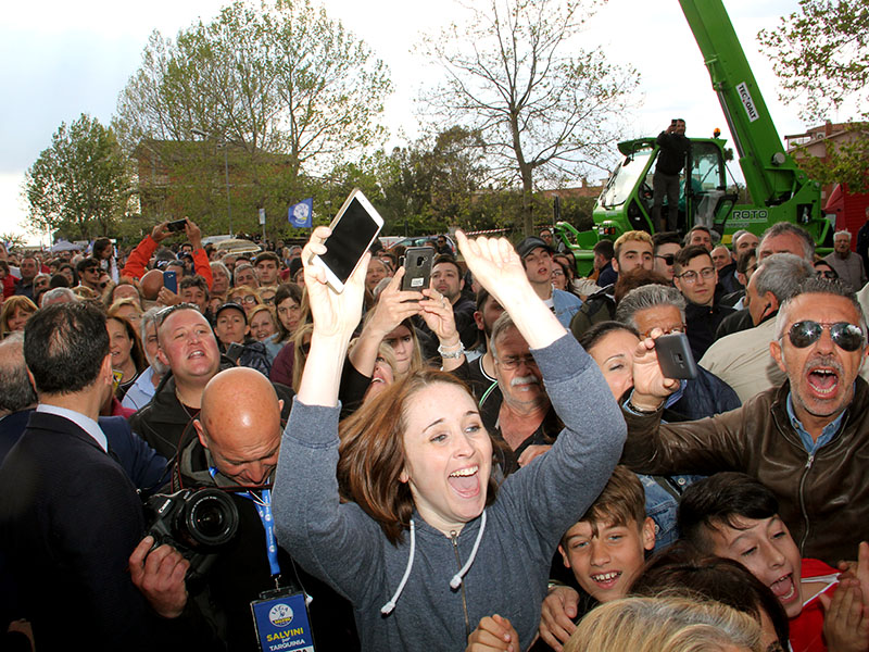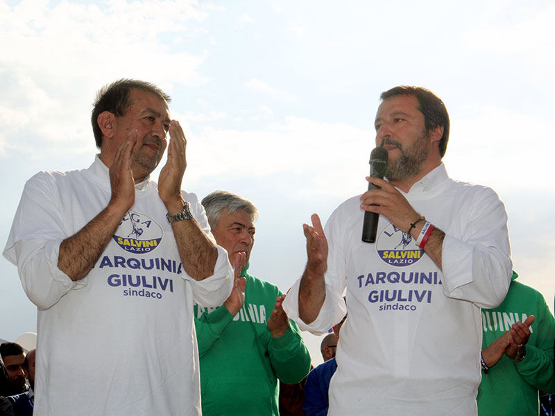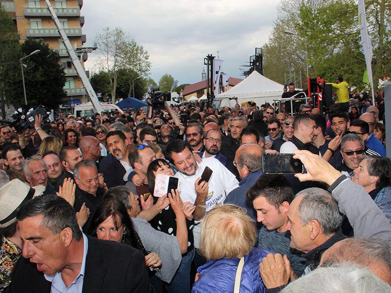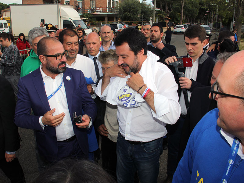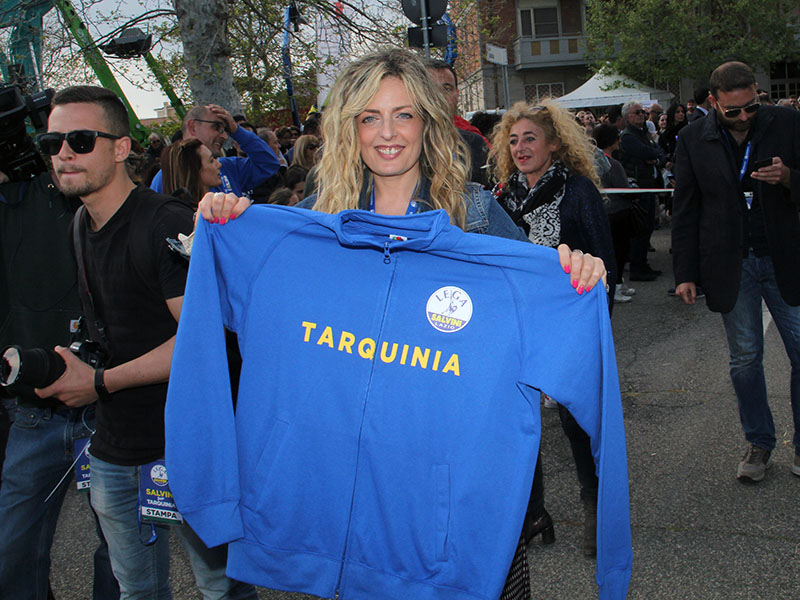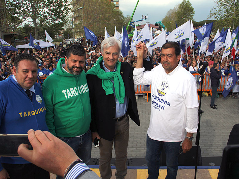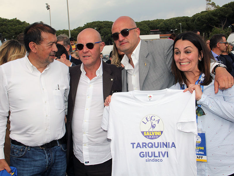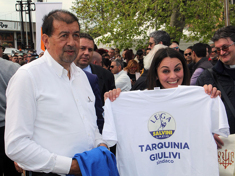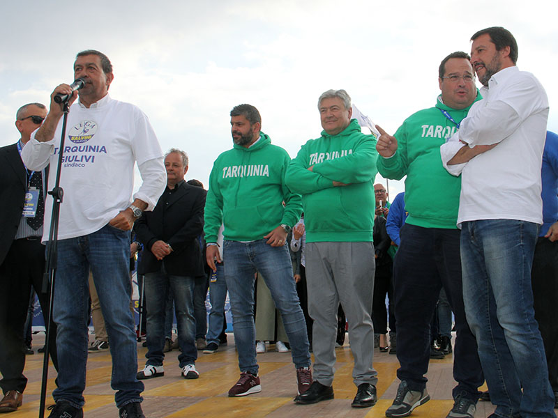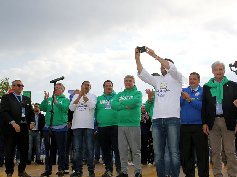 Salta il percorso libero lasciato dalla polizia per immergersi tra la gente, arrivando a fatica sul palco, dove lo attendono già Giulivi, Fusco e tutti i candidati delle tre liste organizzate da Lega Tarquinia.