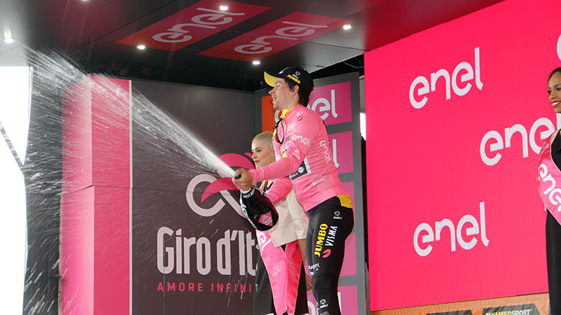 Poco prima festa per Primoz Roglic aveva stappato lo spumante dopo aver mantenuto la maglia rosa, applaudito sotto l'inizio di una pioggerellina e l'esplosione di coriandoli rosa.