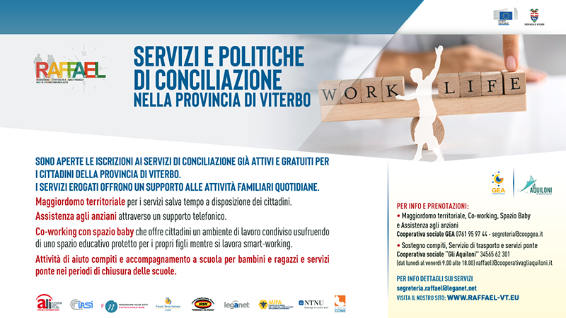 Il progetto R.A.F.F.A.E.L. (Redesigning Activities in a Family Friendly wAy in VitErbo’s workpLaces) infatti, finanziato nel 2019 dal Programma Europeo per l’Occupazione e l’Innovazione sociale (EASI2014-2020), ha l’obiettivo di sviluppare nella Provincia di Viterbo un modello innovativo di servizi per la conciliazione vita-lavoro che si basa sulla collaborazione tra organizzazioni pubbliche e private e sull’integrazione delle misure di welfare pubblico e aziendale.