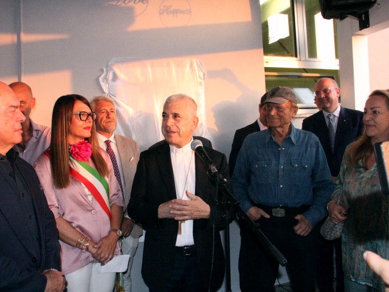 Prima di scoprire la targa la benedizione del vescovo Soddu, anche lui "Cresciuto a pane, Terence e Bud. Impartisco la benedizione che non è solo una croce ma permette di immergersi in questa realtà, per sentire i benefici dell'acqua, sorgente di vita".