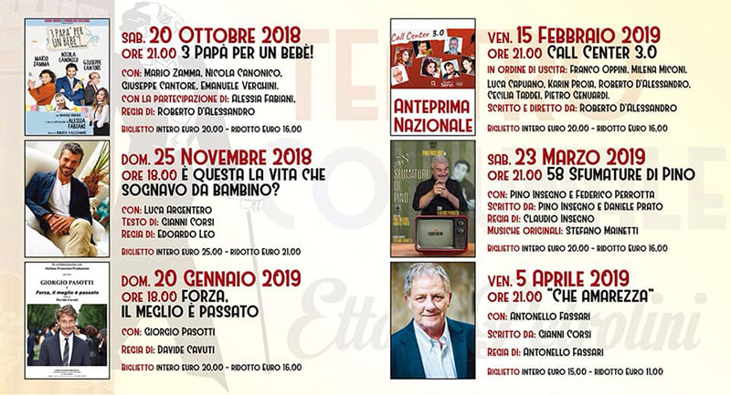 E' possible sottoscrivere abbonamenti: Silver, 3 spettacoli, 3 Papà per un bebé, Forsa il meglio è passato, Che amarezza, 50 euro; Gold, tutti gli spettacoli, 99 euro.