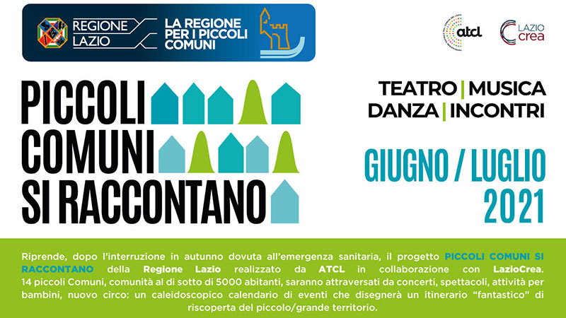 VITERBO - Riprende, dopo l’interruzione in autunno dovuta all’emergenza sanitaria, il progetto "Piccoli Comuni si raccontano" della Regione Lazio realizzato da ATCL in collaborazione con LazioCrea. Dal 6 giugno al 3 luglio 2021, 14 piccoli Comuni, sui 35 dell’intero progetto, comunità al di sotto di 5000 abitanti, saranno attraversati da concerti, spettacoli, attività per bambini, nuovo circo: un caleidoscopico calendario di eventi che disegnerà un itinerario “fantastico” di riscoperta del piccolo/grande territorio.