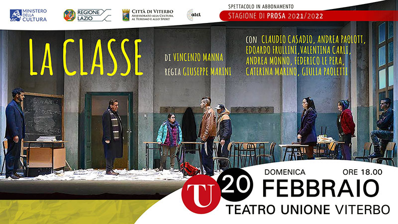 VITERBO - ++++ spettacolo rinviato a martedì 12 aprile alle ore 21. Info in calce +++++ Spettacolo sostenuto da Amnesty International, La classe di Vincenzo Manna, regia di Giuseppe Marini, con Claudio Casadio, Andrea Paolotti, Valentina Carli, Edoardo Frullini, Federico Le Pera, Caterina Marino, Andrea Monno, Giulia Paoletti arriva al Teatro dell’Unione con una nuova data, non più domenica 20 febbraio, ma martedì 12 aprile alle ore 21, nell’ambito della stagione nata dalla collaborazione tra il Comune di Viterbo e ATCL Circuito multidisciplinare del Lazio, sostenuto da MIC – Ministero della Cultura e Regione Lazio.