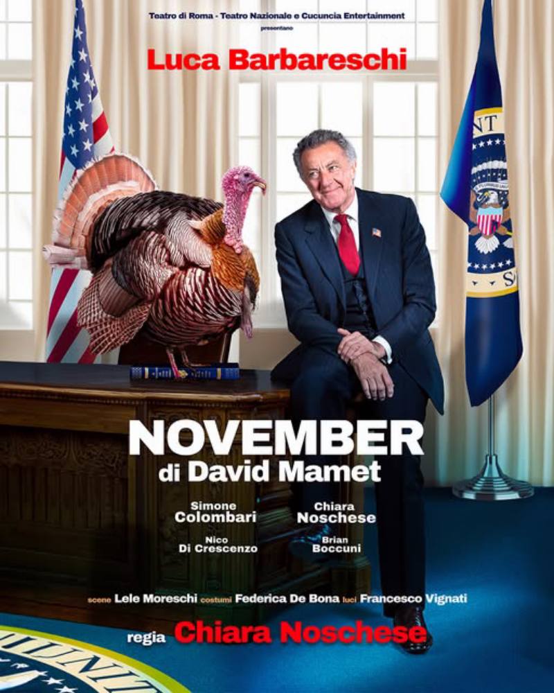 TARQUINIA - Il teatro comunale "Rossella Falk" di Tarquinia ospiterà il 1° marzo, alle 21, "November", una commedia di David Mamet, diretta e interpretata da Chiara Noschese, con Luca Barbareschi nel ruolo del presidente Charl Smith.