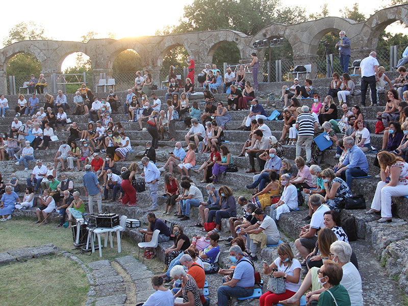 C'è il pubblico delle grandi occasioni per questo spettacolo a Ferento, un appuntamento al tramonto che ha fatto il sold out, nei tempi del distanziamento e degli spalti contingentati.