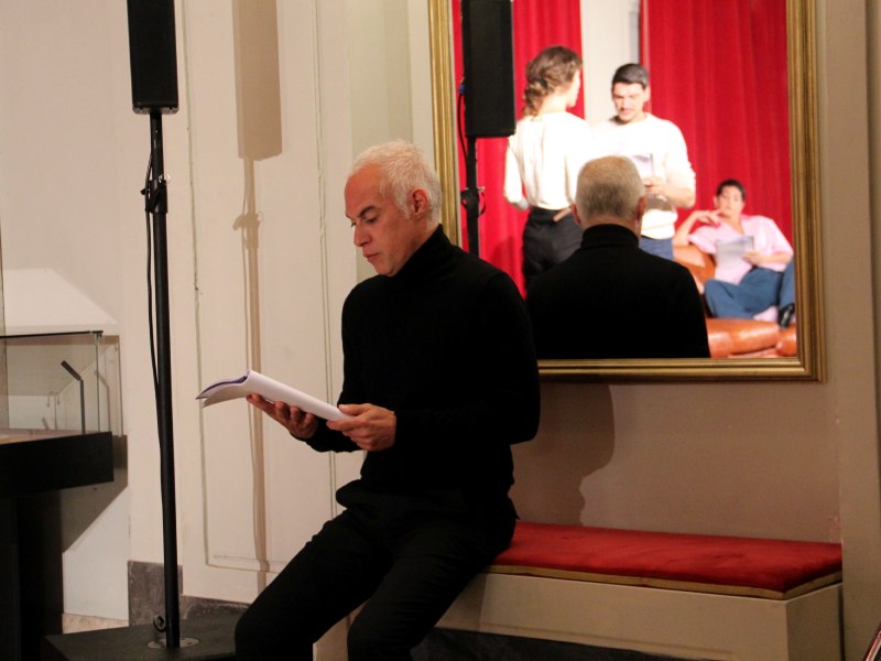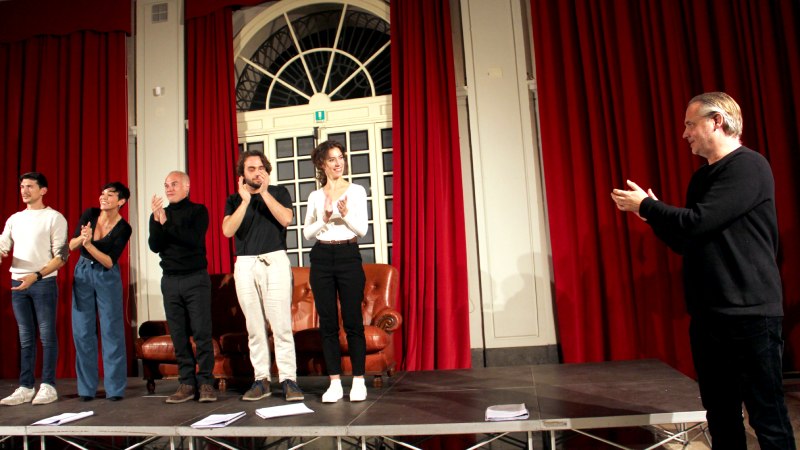 Ad accogliere il pubblico il direttore artistico e ideatore della rassegna Gian Maria Cervo: "Quartieri dell'arte ha sempre avuto un grande rapporto con il teatro scandinavo, partendo dal drammaturgo Premio Nobel Jon Fosse, ed ora siamo lieti di avere qui Mattias". Il regista ha lavorato alcuni giorni con gli attori, seguendo la nascita di questa rappresentazione, ed ha così annunciato ai presenti l'esperienza: "Quest'opera ha avuto la sua prima nel 2020, un processo creativo lungo, oggi vedremo una mise en espace (lettura scenica, ndr) orientata sul testo, su cui abbiamo lavorato negli ultimi quattro giorni, creando una composizione intensiva".